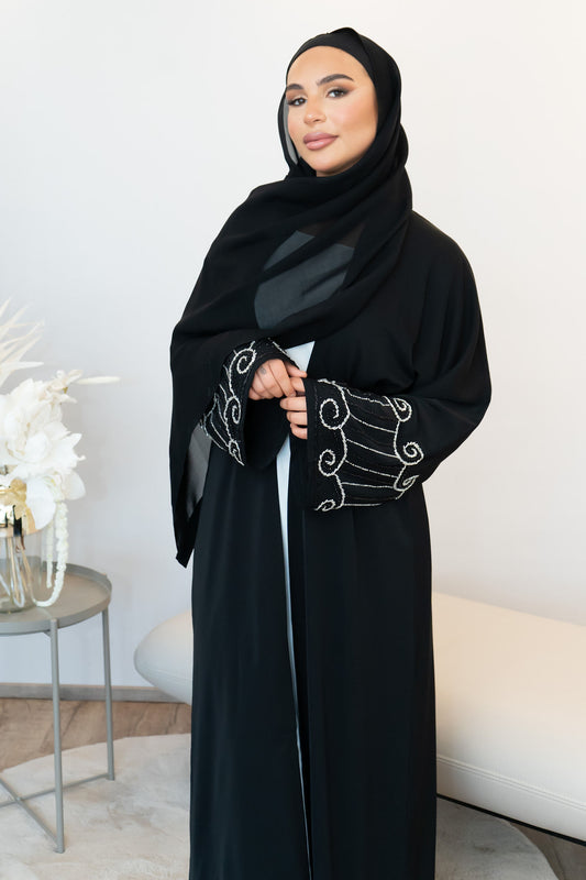 AusverkauftAbaya mit schwarzen Perlen und Federn
