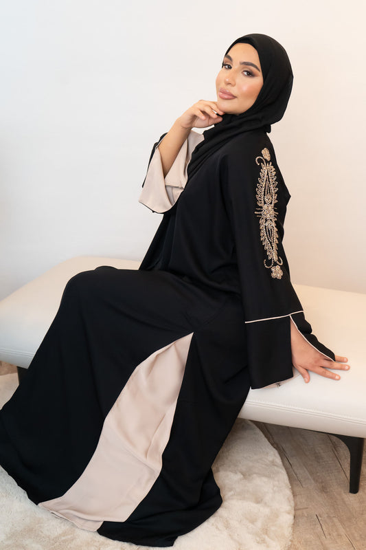 Elegante schwarze Abaya mit roséfarbenen Stickereien