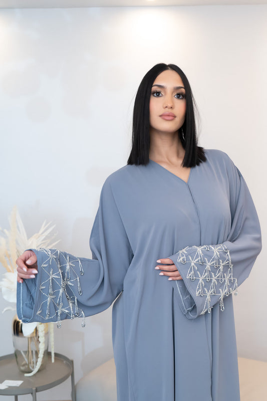 Elegante blaugraue Abaya mit hängenden silbernen Steinen