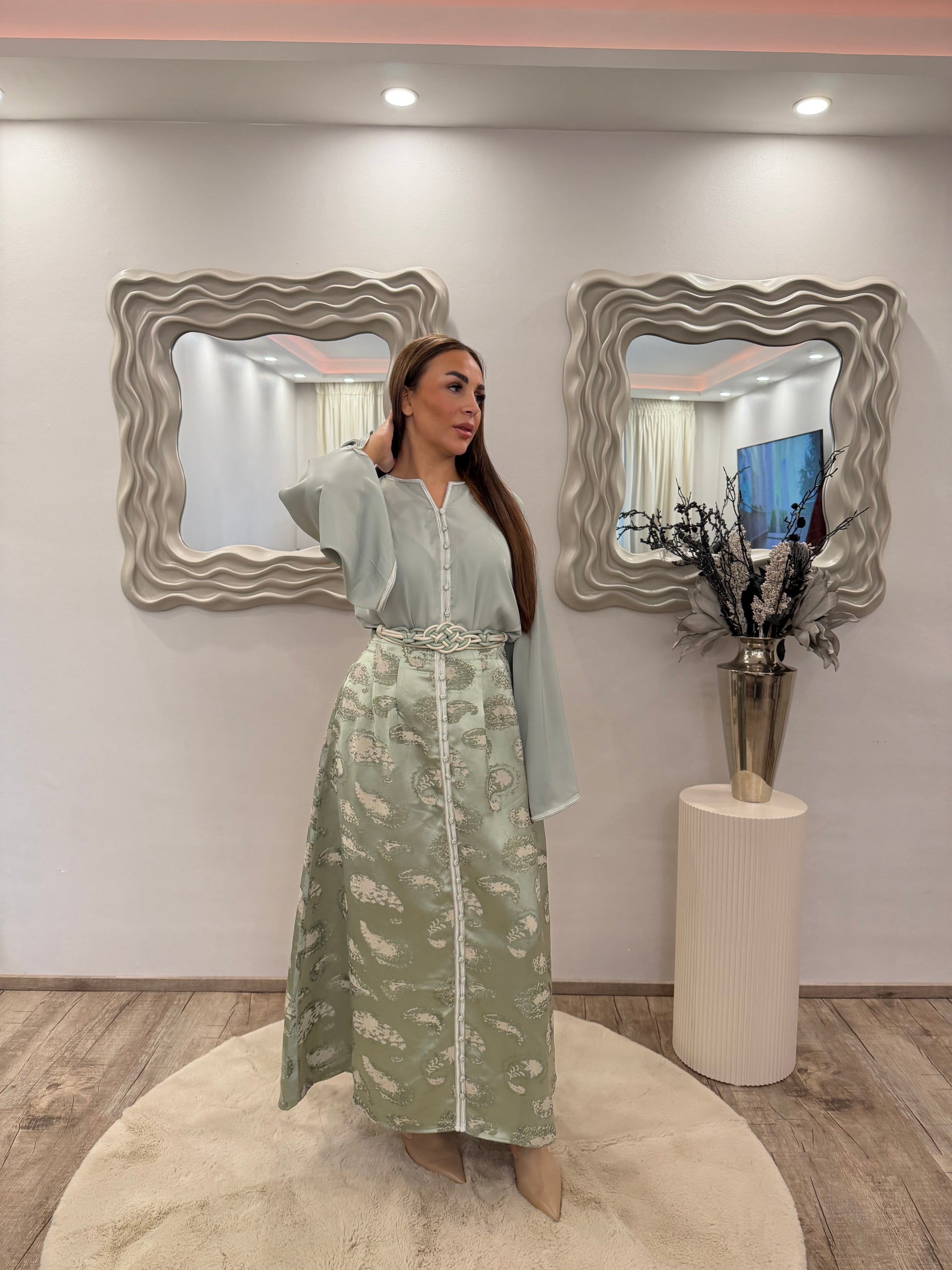 Dreiteiliges Set bestehend aus Oberteil, Gürtel und und Rock